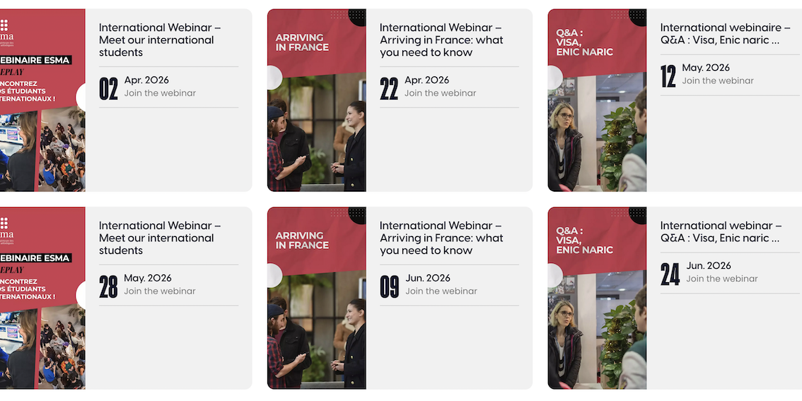 L’ESMA organise 2 fois par mois, d’avril à juin, des webinaires à destination des étudiants étrangers pour leur fournir toutes les informations essentielles à leur arrivée en France. Plusieurs sujets clés seront abordés tels que le logement, l’ouverture des comptes d’abonnement et les démarches administratives. A découvrir également : les différences culturelles, des conseils pour faciliter son intégration. A retrouver ici : www.esma-artistique.com/en/meet-us/?f_type=1251&f_campus=